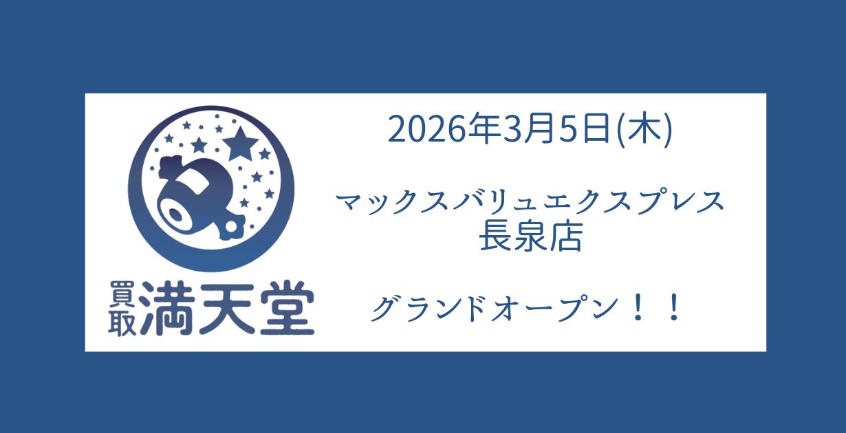 お知らせ2026.03.04 買取満天堂 マックスバリュエクスプレス長泉店 グランドオープンのお知らせ 買取満天堂 静岡県内続々展開中!! 2026年3月5日(木)に買取満天堂 マックスバリュエクスプレス長泉店がグランドオープンいたします! お買い物のついでに、気軽に査定♪ お近くの方はぜひ、お気軽にお越しくださいませ。 【アクセス】 店舗情報はこちら お知らせ一覧